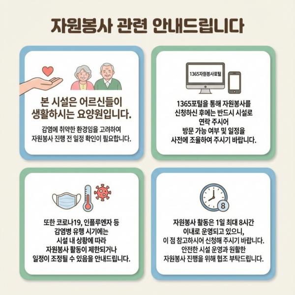 º» ½Ã¼³Àº ¾î¸£½ÅµéÀÌ »ýȰÇϽô ¿ä¾ç¿øÀ¸·Î, °¨¿°¿¡ Ãë¾àÇÑ È¯°æÀÓÀ» °í·ÁÇÏ¿© ÀÚ¿øºÀ»ç ÁøÇà Àü ÀÏÁ¤ È®ÀÎÀÌ ÇÊ¿äÇÕ´Ï´Ù.