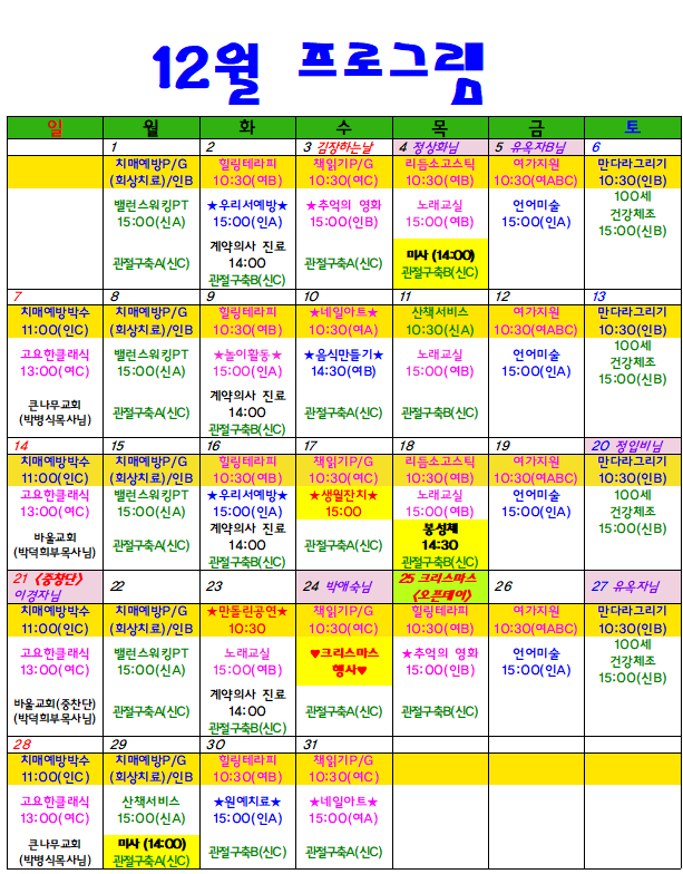 12¿ù ÇÑ ´Þ µ¿¾È ÁøÇàµÉ ÁÖ¿ä ÇÁ·Î±×·¥ ÀÏÁ¤À» ¾Æ·¡¿Í °°ÀÌ ¾È³»µå¸³´Ï´Ù.