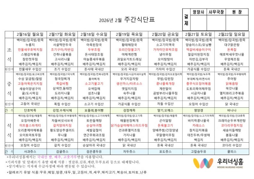 Á¦¸ñ :2026³â 2¿ù ¼Â°ÁÖ ½Ä´ÜÇ¥(2,16~2,22)