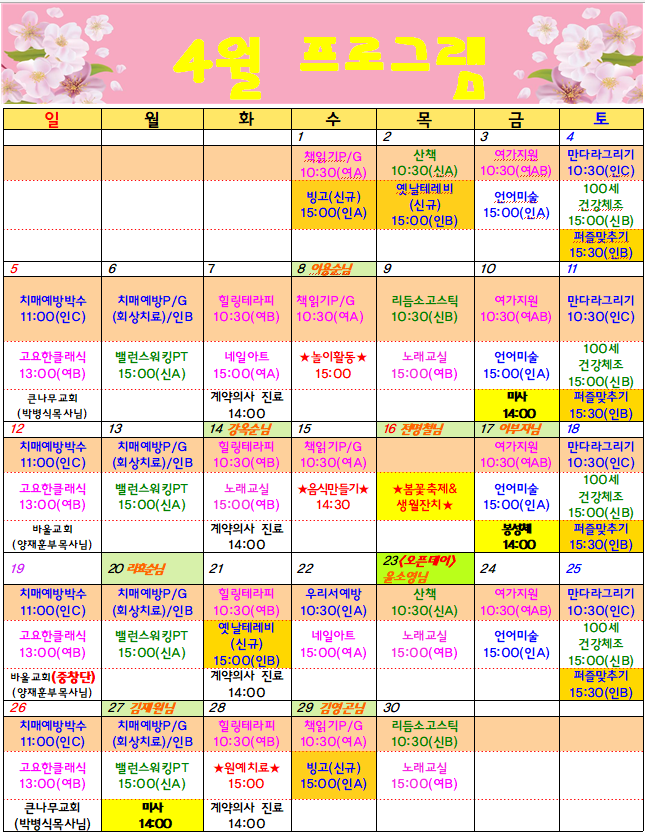 4¿ù ÇÑ ´Þ µ¿¾È ÁøÇàµÉ ÁÖ¿ä ÇÁ·Î±×·¥ ÀÏÁ¤À» ¾Æ·¡¿Í °°ÀÌ ¾È³»µå¸³´Ï´Ù.